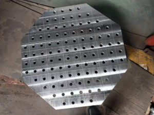 三維八角平臺(tái)是三維柔性組合工裝夾具系統(tǒng)的基礎(chǔ)平臺(tái),分為D28和D16兩種。D28系列平臺(tái)孔距100mm,平面刻有100X100的網(wǎng)格線(xiàn),D16系列平臺(tái)孔距為50mm,刻有50X50的網(wǎng)格線(xiàn),方便工件目視檢測(cè)。根據(jù)用戶(hù)要求,在平臺(tái)的兩直角邊上面可以刻畫(huà)毫米標(biāo)度尺。